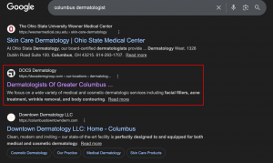 DOCS was strategic about their page buildout. They built a location-specific page, Columbus location page. What this does is help them rank for the coveted query, “Columbus Dermatologist.”