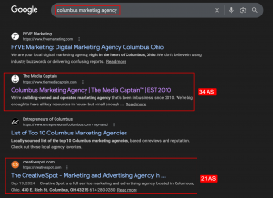 For example, we’re ranking at No. 2 for “Columbus marketing agency” — ahead of our competitor The Creative Spot, which has an Authority Score of just 21 compared to our 34.
