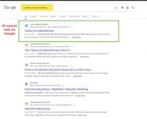 Post-launch, they saw a nice surge in blog rankings and started ranking extremely well for coveted terms like “History of Hydroforming.” Beforehand, they weren’t in the Top 10 because the blog was coming from a less authoritative site.