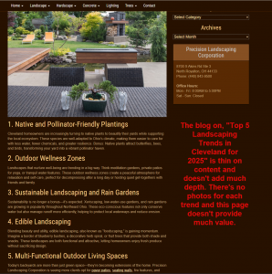 For example, a landscaping company might publish a blog like “Low Maintenance Landscaping in Cleveland” while also trying to rank a service page for “Cleveland landscaping services.” Now Google has to decide which page to rank. And often, neither performs as well as it should.